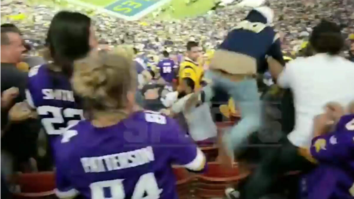 While the Los Angeles Rams and the Minnesota Vikings battled it out on the field on Thursday (9/27) night, fans decided to settle their differences in the stands. Video obtained by TMZSports shows a wild melee between two groups of rival fans that ended with one guy getting tossed down four rows of hard plastic seats.