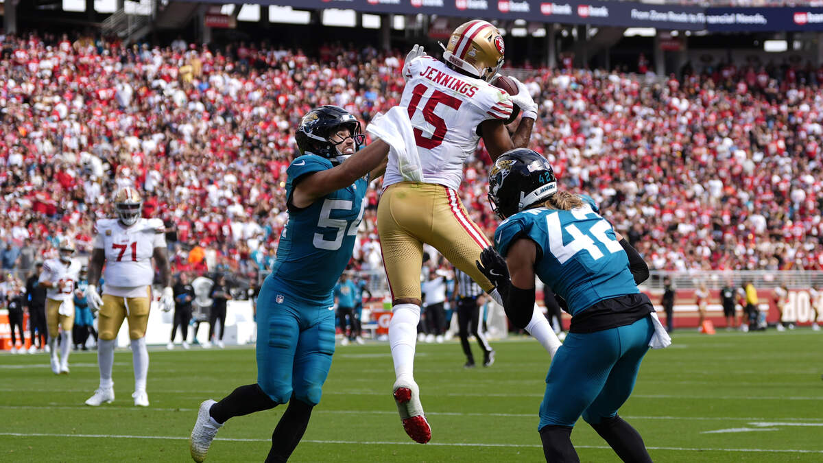 Jauan Jennings' nine grabs (on 19 targets) have netted him 129 yards (to average 43.0 per game) and one TD.
